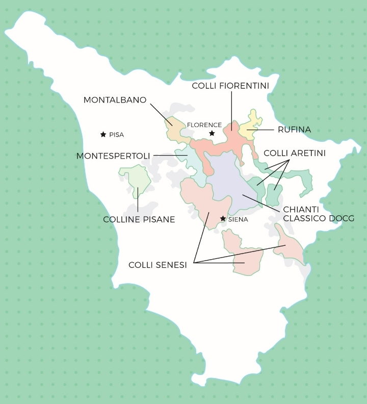 A área que no futuro seria a do Chianti Clássico DOCG, está localizada no coração da Toscana, são cerca de 20 km2 entre as províncias de Florença, Siena e Arezzo. Desde 1932 o Chianti Clássico só pode ser produzido dentro dos 7.800 hectares delimitados, ou seja, integralmente dentro de Radda, Gaiole, Castelina e Greve, parcialmente dentro das demais (coloquei links para as páginas oficiais de cada região):
