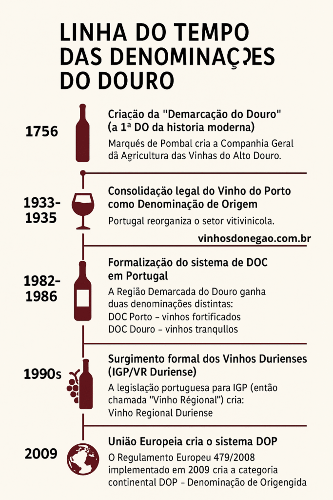 Aqui vai um resumo rápido, direto e cronológico explicando DOP, DOC e Vinhos Durienses numa linha do tempo direta, clara e cronológica.