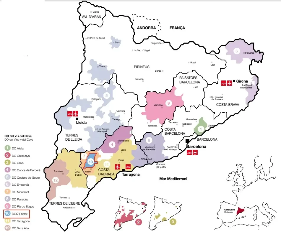 | Montsant (D.O.) | Mistura de solos, incluindo Llicorella e Calcário. Vinhos frutados, concentrados e sedosos, com grande foco em Garnacha e Cariñena. |